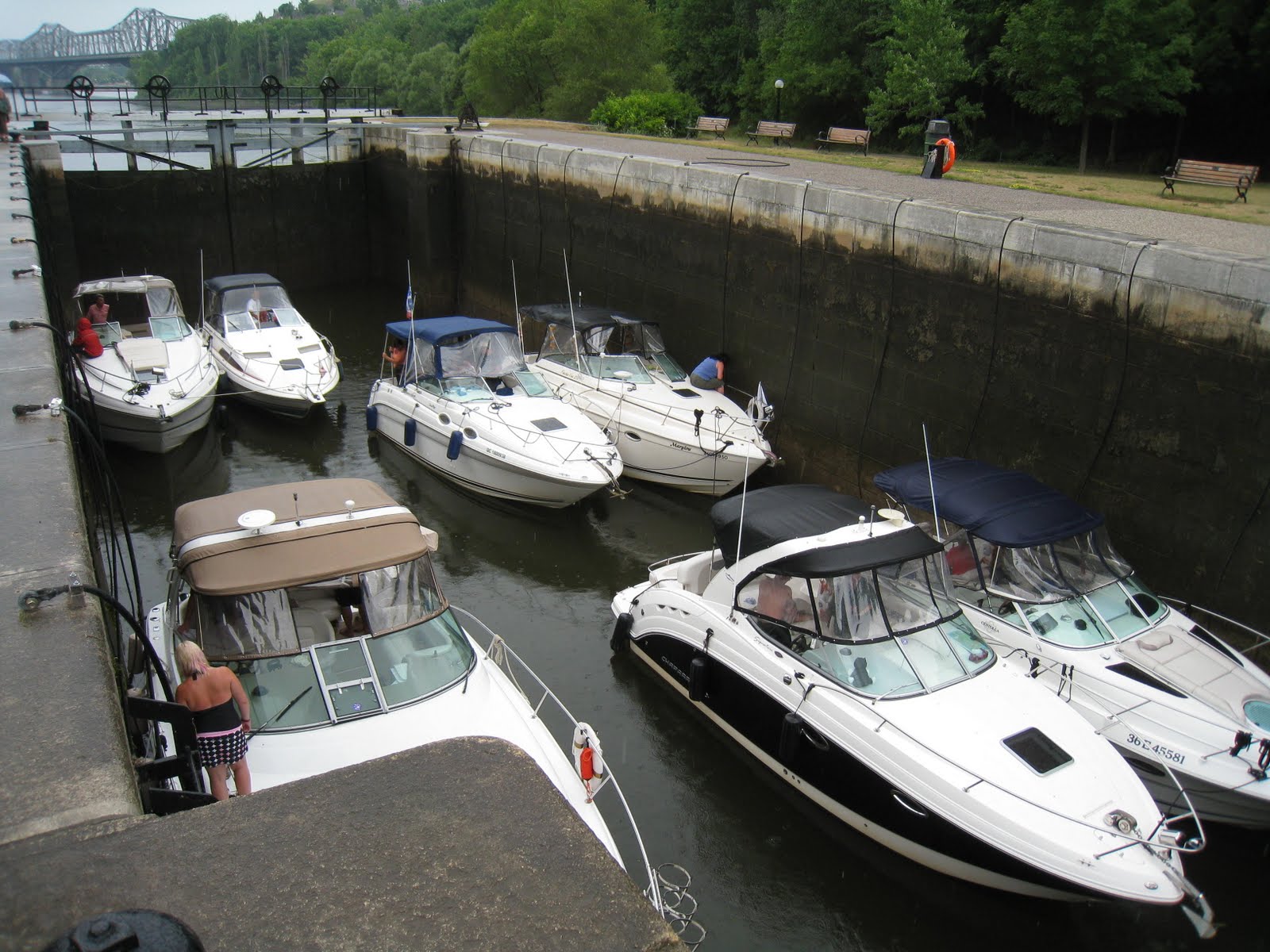 We tied to the lower wall at St A de Bellevue this morning after anchoring last night in a little bay just west of the lock. We departed Ottawa on Wednesday and after descending the eight locks into the Ottawa River anchored about 6 miles downstream at Little Duck Island. Thursday night we were in a small Marina at Montebello where we took on water for the first time in eight days (72 gallons) and did three loads of wash. On Friday we locked through Carillon Lock, the tallest lock in Canada with a 66 foot drop, then tied up for the night on their lower wall.